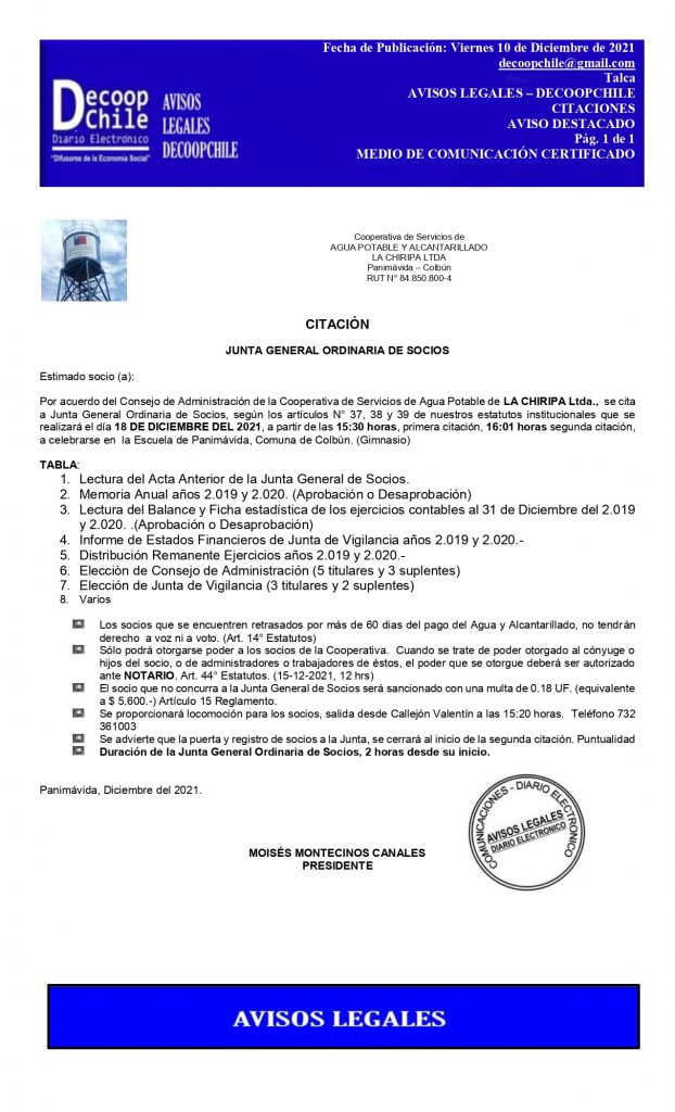 Se cita a Junta General de Socios de la Cooperativa de Servicios de Agua Potable de La Chiripa Ltda, que se llevara a cabo el próximo 18 de Diciembre de 2021. DESCARGAR PDF