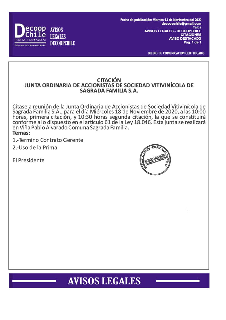 Se cita a Junta Ordinaria de Accionistas de Sociedad Vitivinícola de Sagrada Familia S.A., que se llevara a cabo el próximo 18 de Noviembre de 2020. DESCARGAR PDF