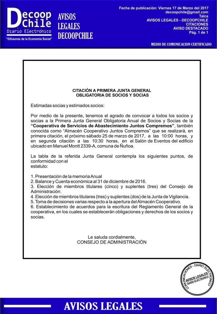 item-thumbnailSe cita a Junta general a los socios de la Cooperativa de servicios de abastecimiento Juntos Compremos este sábado 25 de marzo a las 10: oo horas,  y  en  segunda  citación  a  las  10:30  horas,  en  el Salón de Eventos del edificio ubicado en Manuel Montt 2339-A, comuna de Ñuñoa.