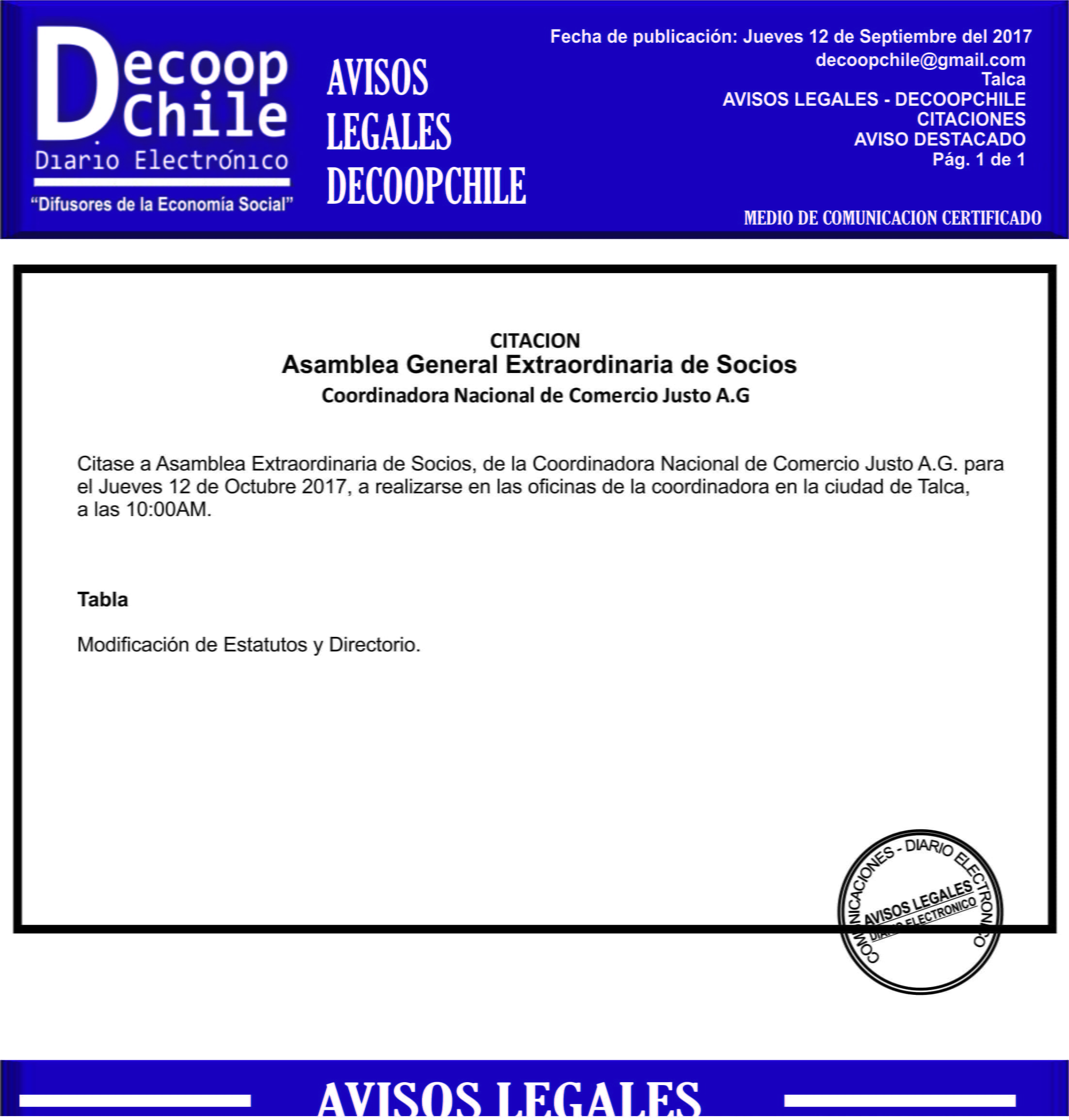 Junta Extraordinaria de Socios: Coordinadora Nacional de Comercio Justo A.G