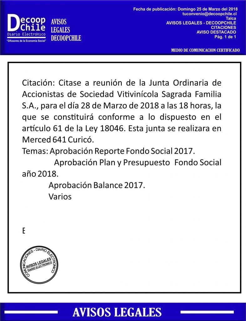 La Sociedad Vitivinícola Sagrada Familia cita a una junta general de accionistas para el día 28 de marzo de 2018.