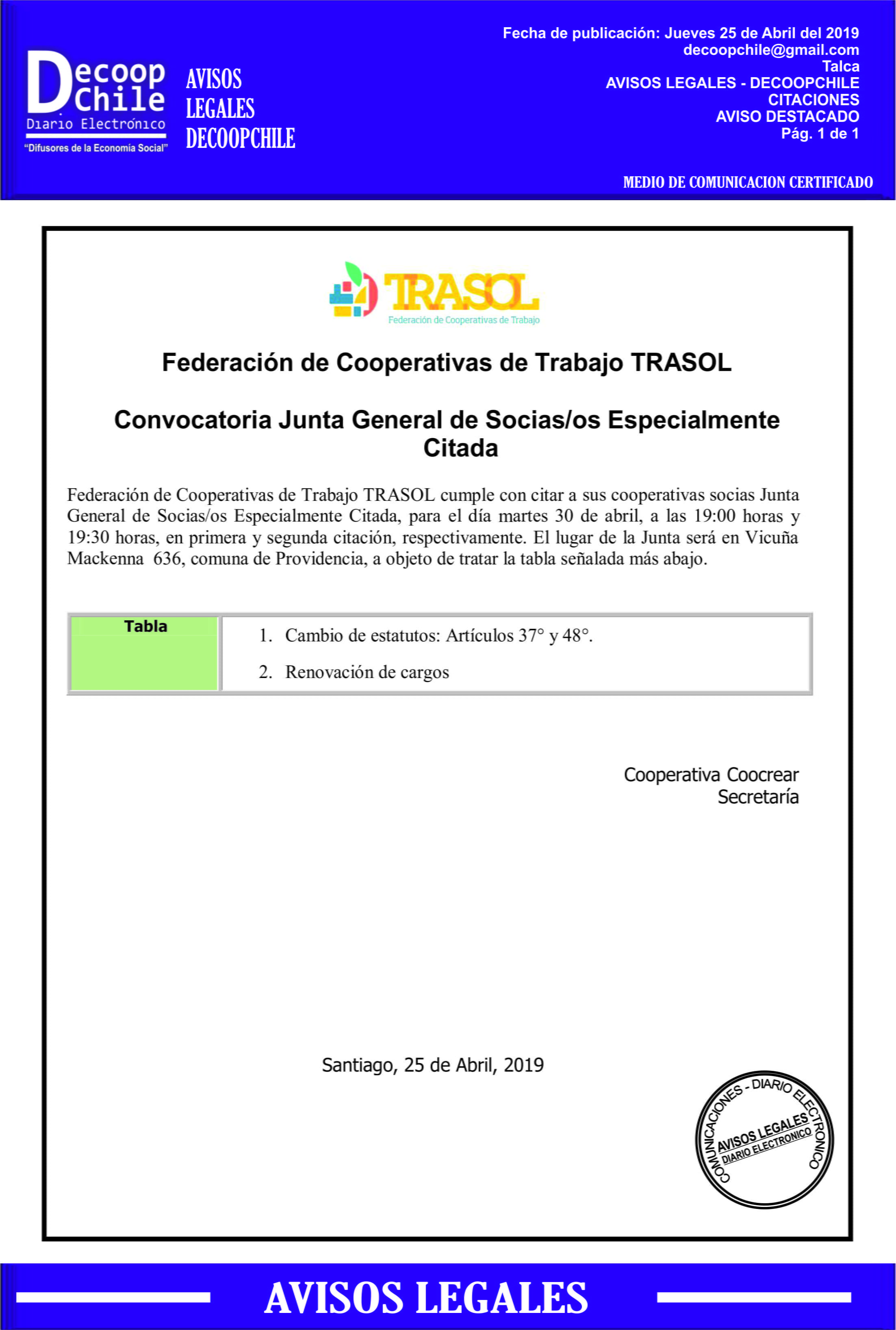 Se cita a Junta de Socios de la Federación de Cooperativas de Trabajo TRASOL, que se llevará a cabo el próximo 30 de Abril.