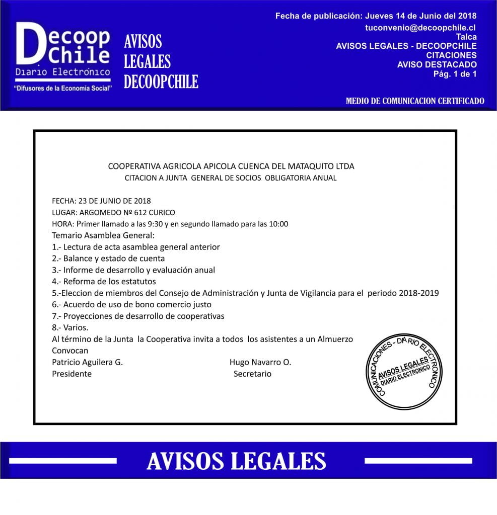 Se cita a Junta general a los socios de la Cooperativa Agrícola Apicola Cuenca del Mataquito Ltda que se llevará a cabo el próximo 30 de Junio.