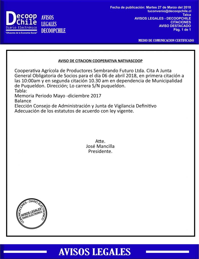 La ”Cooperativa Agrícola de Productores Sembrando Futuro Ltda” cita a una junta general de socios para el día 06 de Abril de 2018.