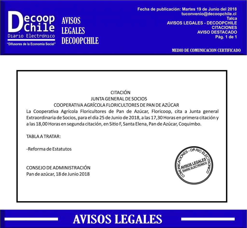 Se cita a Junta general a los socios de la Cooperativa Agrícola Floricultores de Pan de Azúcar que se llevará a cabo el próximo 25 de Junio.