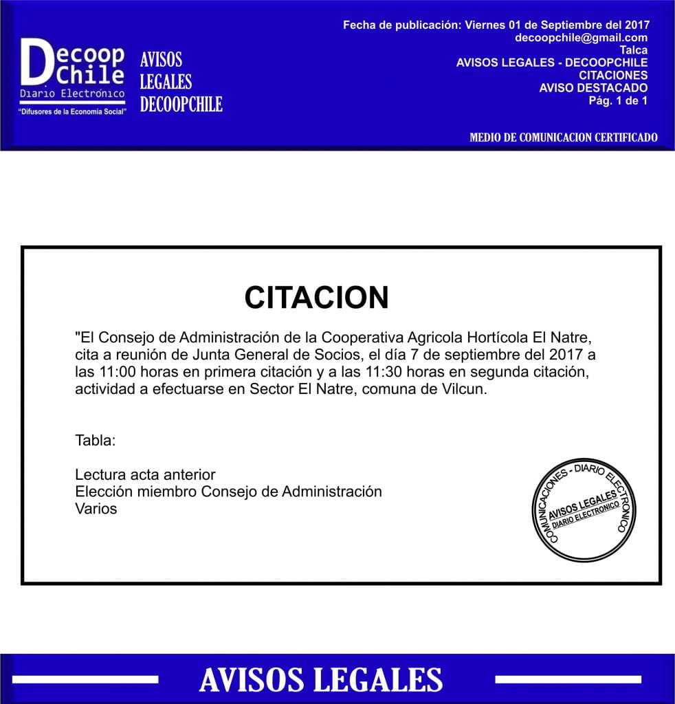 Se cita a Junta general a los socios de la Cooperativa Agrícola Horticola El Natre Ltda. que se llevará a cabo el próximo 07 de Septiembre.