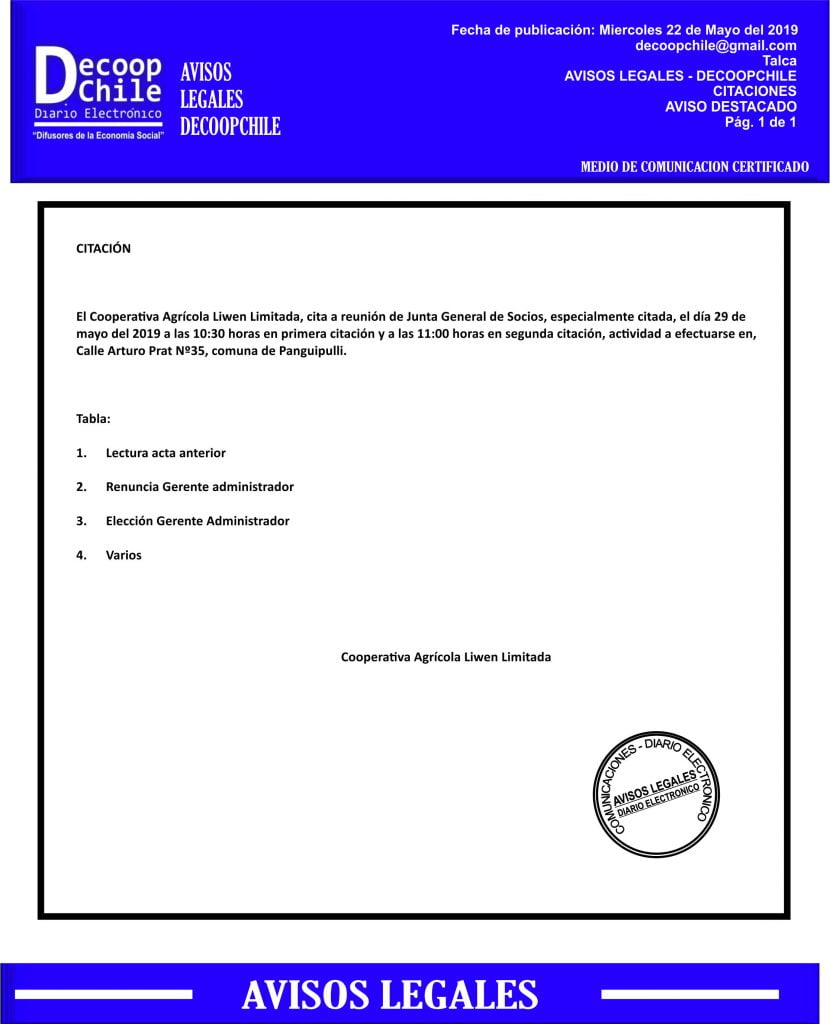 Se cita a  Junta de Socios  de la Cooperativa Agricola Liwen que se llevará a cabo el próximo 29 de Mayo.