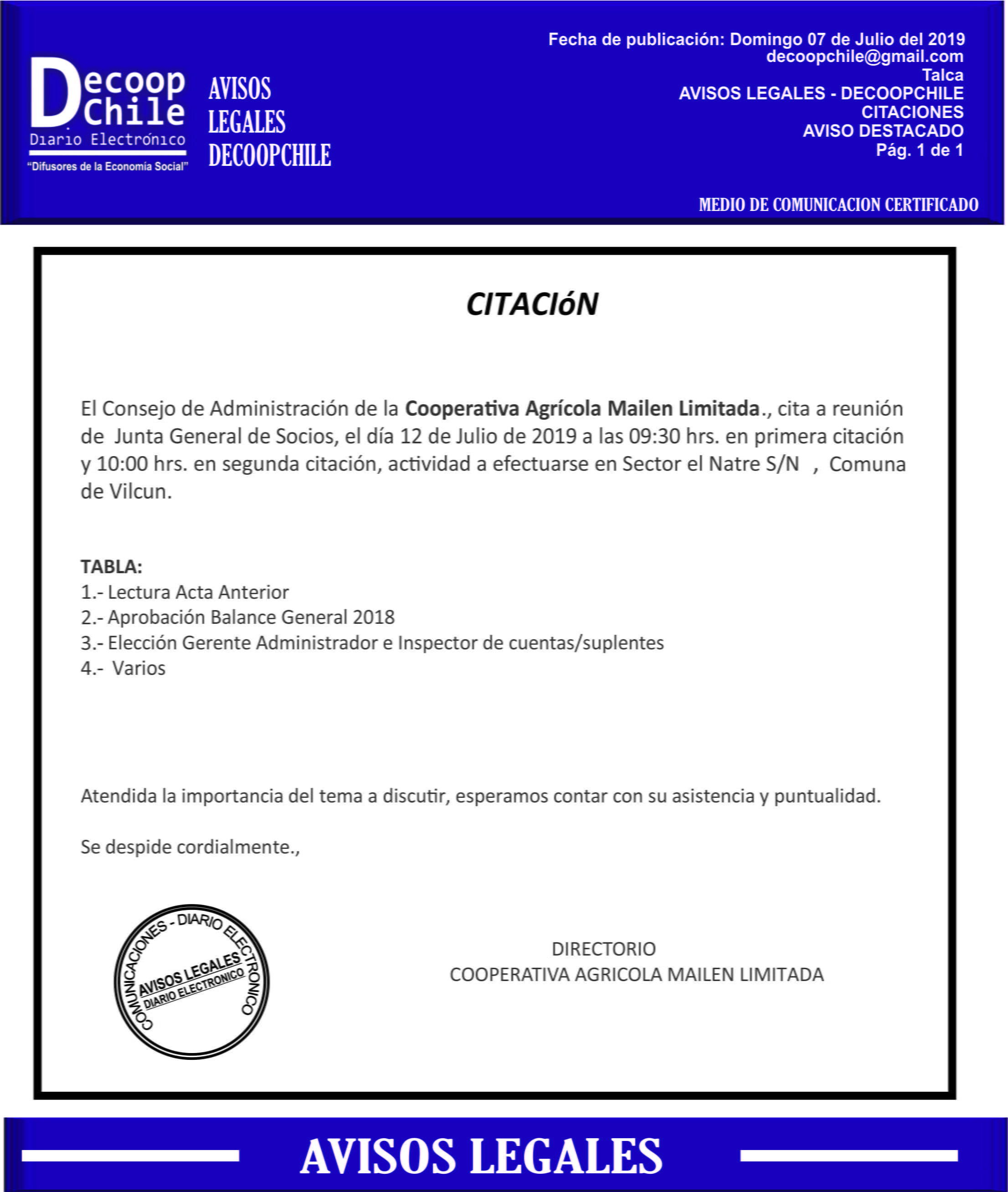 Se cita a Junta de Socios de la Cooperativa Agrícola Mailen Limitada, que se llevará a cabo el próximo 12 de Julio