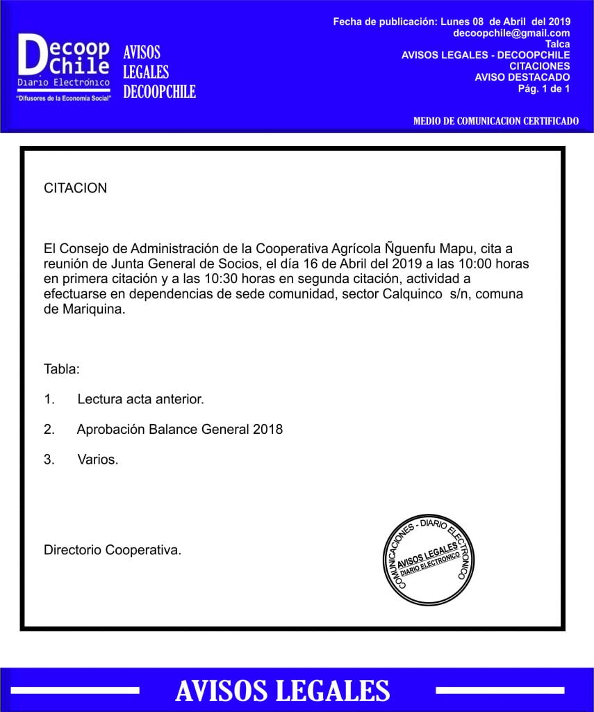 Se cita a  Junta de Socios  de la Cooperativa Agricola Ñguenfu Mapu, que se llevará a cabo el próximo 16 de Abril.