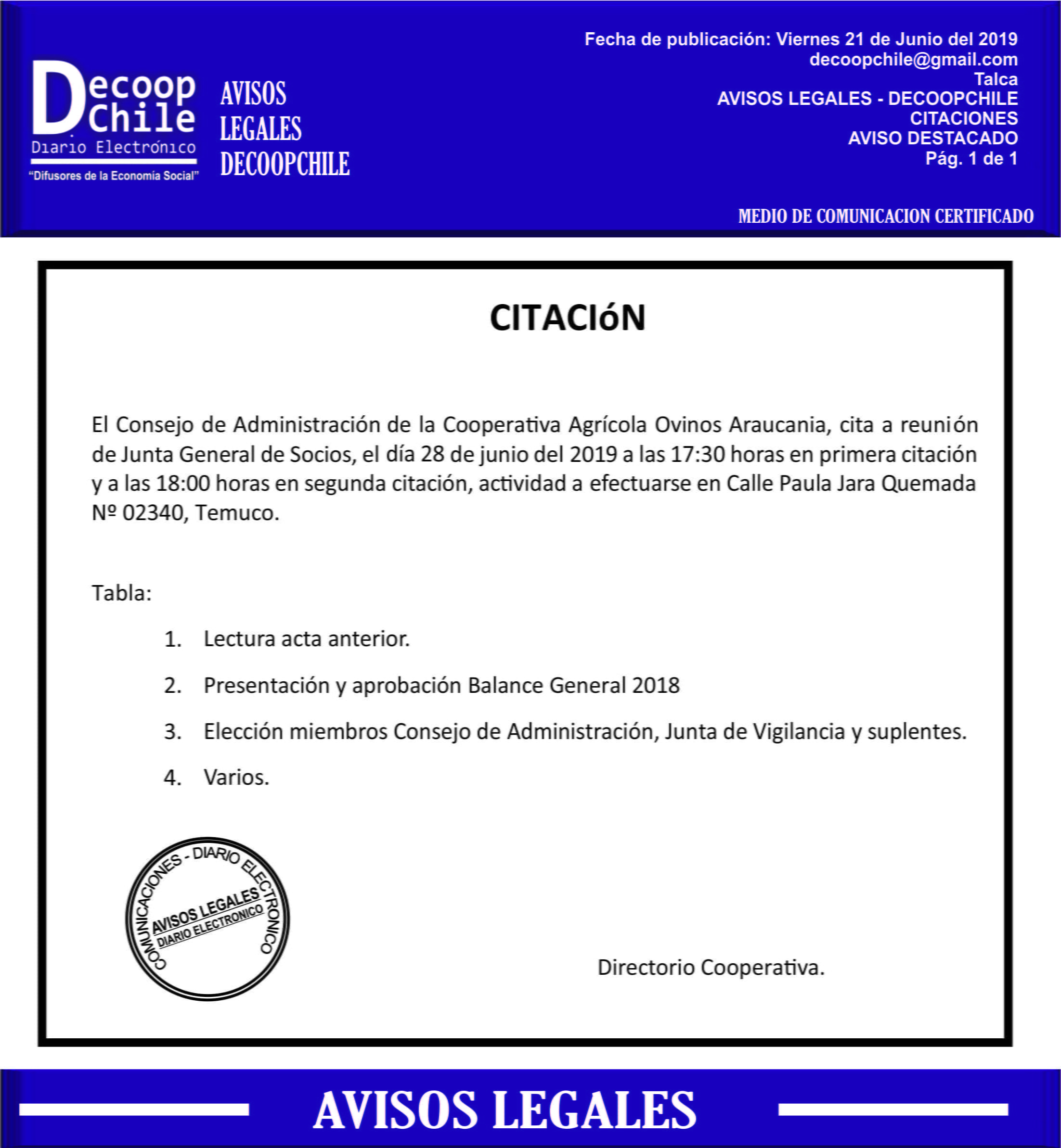 Se cita a Junta de Socios de la Cooperativa Agrícola Ovinos Araucania, que se llevará a cabo el próximo 28 de Junio