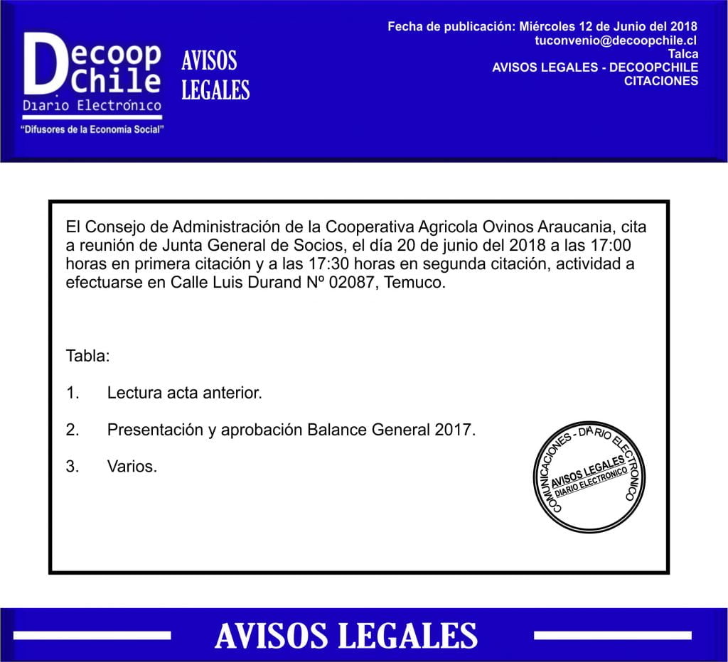 Se cita a Junta general a los socios de la Cooperativa Agrícola Ovinos Araucania que se llevará a cabo el próximo 20 de Junio.
