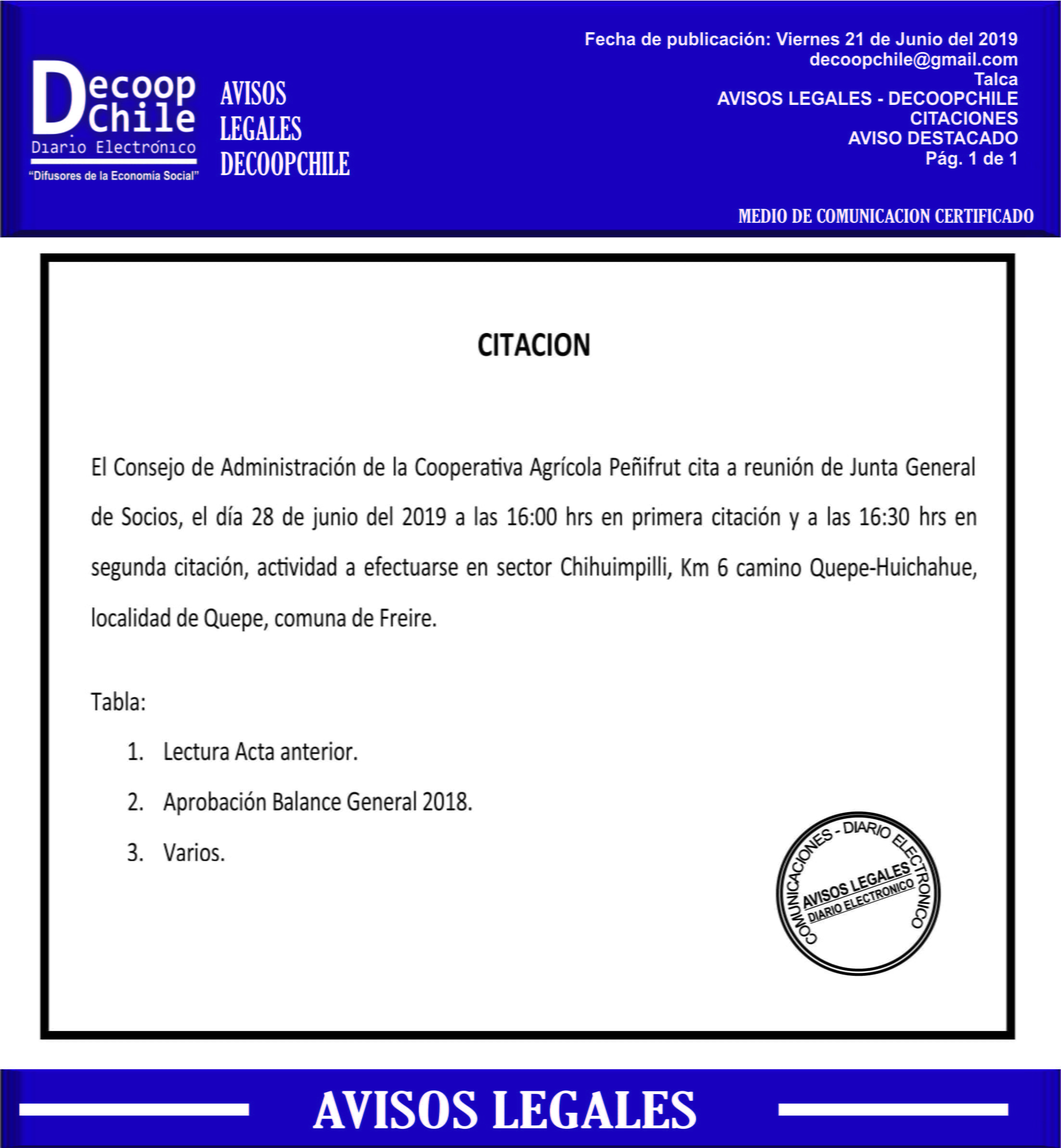 Se cita a Junta de Socios de la Cooperativa Agrícola Peñifrut, que se llevará a cabo el próximo 28 de Junio