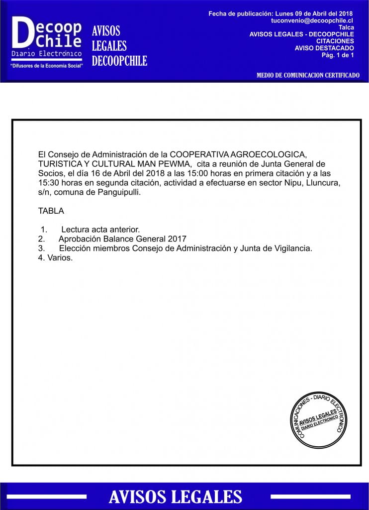 La ”COOPERATIVA AGROECOLOGICA, TURISTICA Y CULTURAL MAN PEWMA, ” cita a una junta general de socios para el día 16 de Abril de 2018.