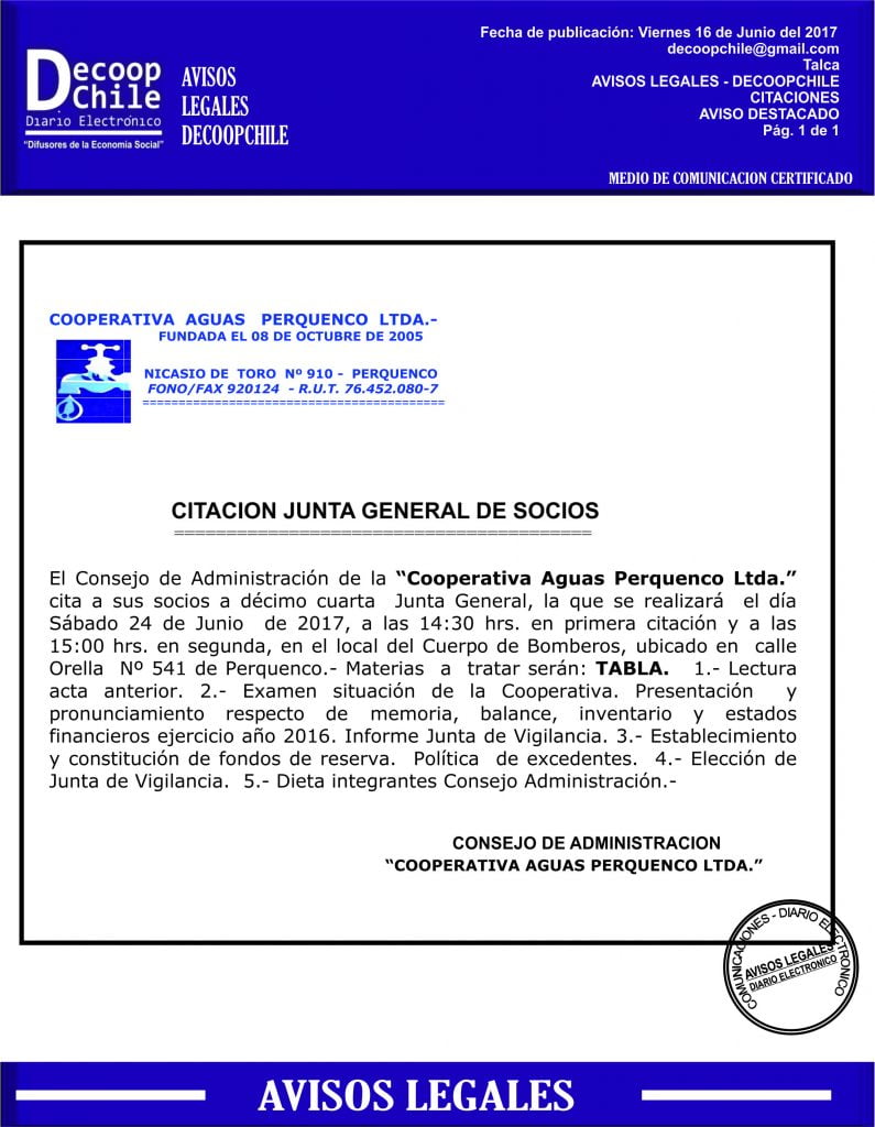 Se cita a Junta general a los socios de Cooperativa Aguas Perquenco Ltda, que se llevará a cabo el próximo 24 de Junio.