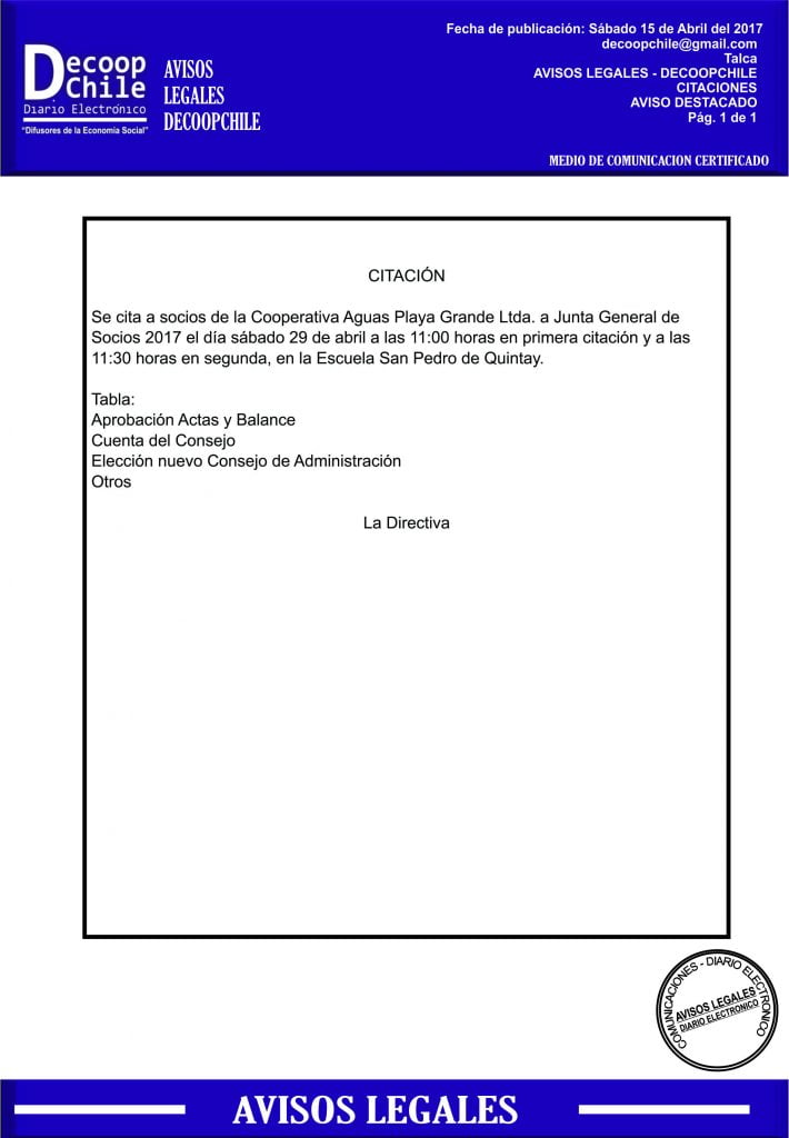 Se cita a Junta general a los socios de la Cooperativa Aguas Playa Grande Ltda, que se llevará a cabo el próximo 29 de abril.