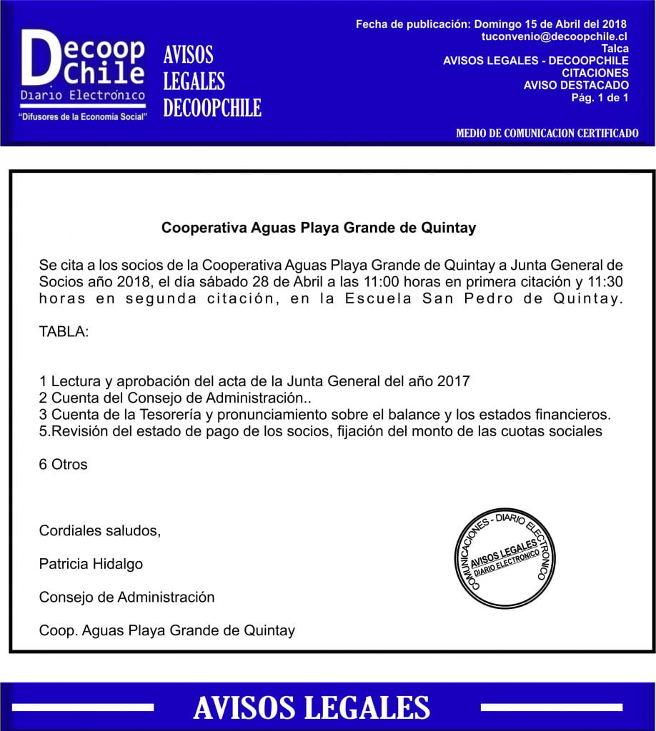 item-thumbnailLa ”Cooperativa Aguas Playa Grande Quintay” cita a una junta general de socios para el día 28 de Abril de 2018.