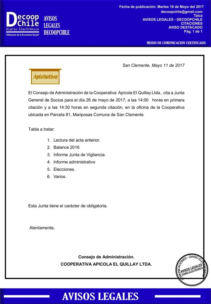 Se cita a Junta general a los socios de la Cooperativa Apícola el Quillay Ltda., que se llevará a cabo el próximo 26 de mayo.