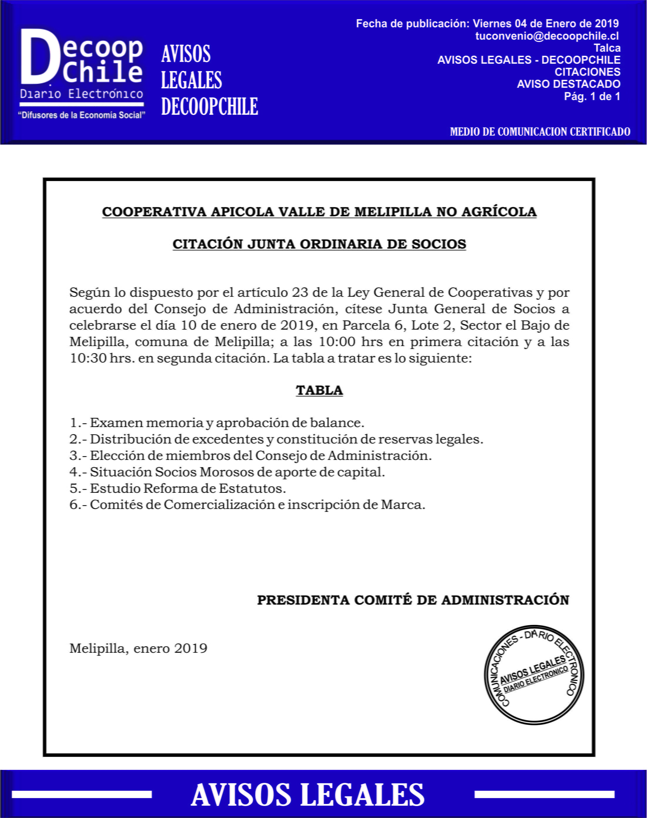 Junta General de Socios: Cooperativa Apicola Valle de Melipilla