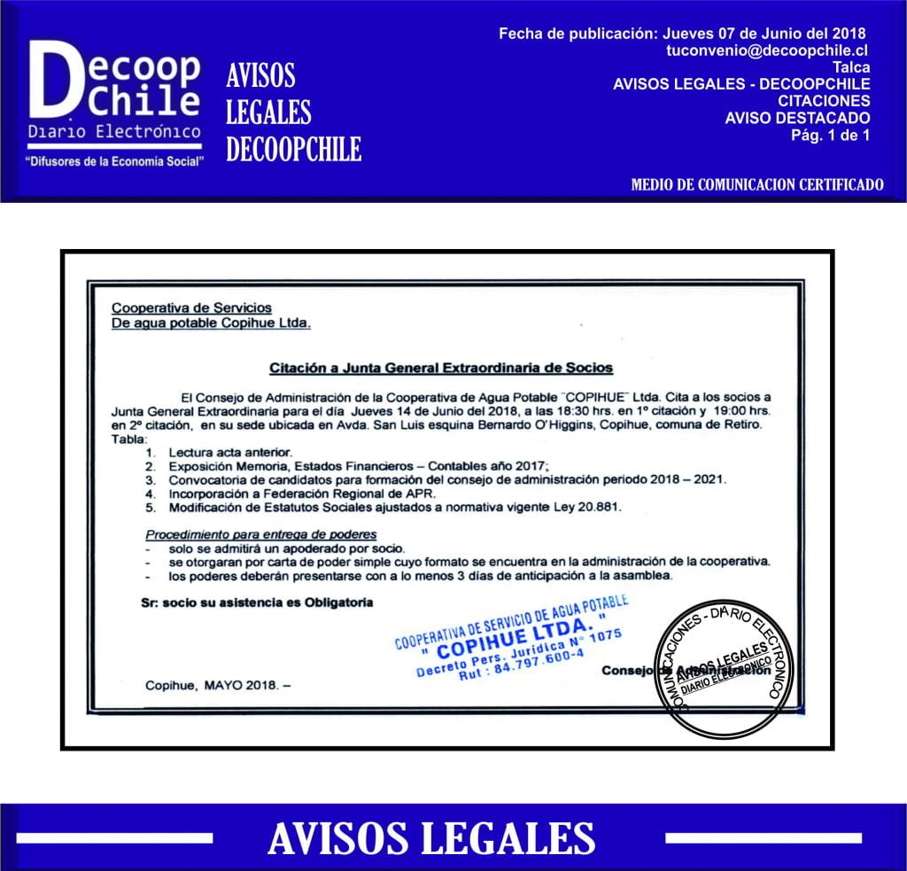 Se cita a Junta general a los socios de la Junta General de Socios: Cooperativa APR Copihue que se llevará a cabo el próximo 14 de Junio.