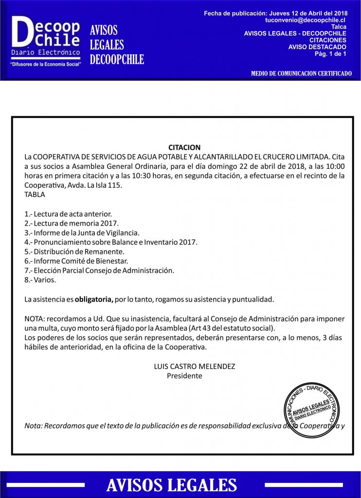 La ” Cooperativa APR CRUCERO ” cita a una junta general de socios para el día 22 de Abril de 2018.