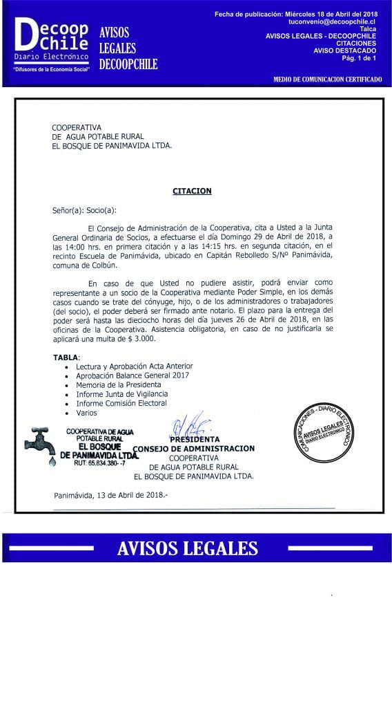 La Cooperativa APR El Bosque Panimavida. . cita a una junta general de socios para el día 29 de Abril de 2018.
