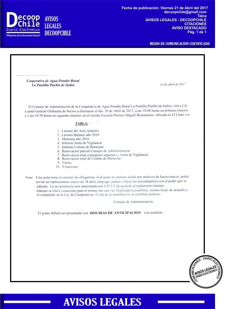 Se cita a Junta general a los socios de la Cooperativa APR La Puntilla Pueblo de Indios Ltda, que se llevará a cabo el próximo 30 de abril.