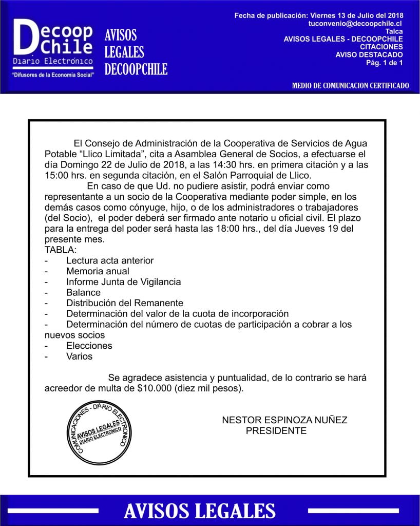 Se cita a Junta de Socios de la Cooperativa APR LLICO, que se llevará a cabo el próximo 22 de Julio.