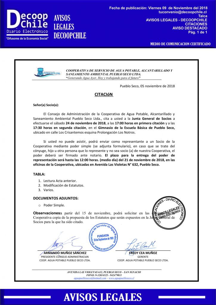 Se cita a Junta de Socios de la Cooperativa APR Pueblo Seco, que se llevará a cabo el próximo 24 de Noviembre .