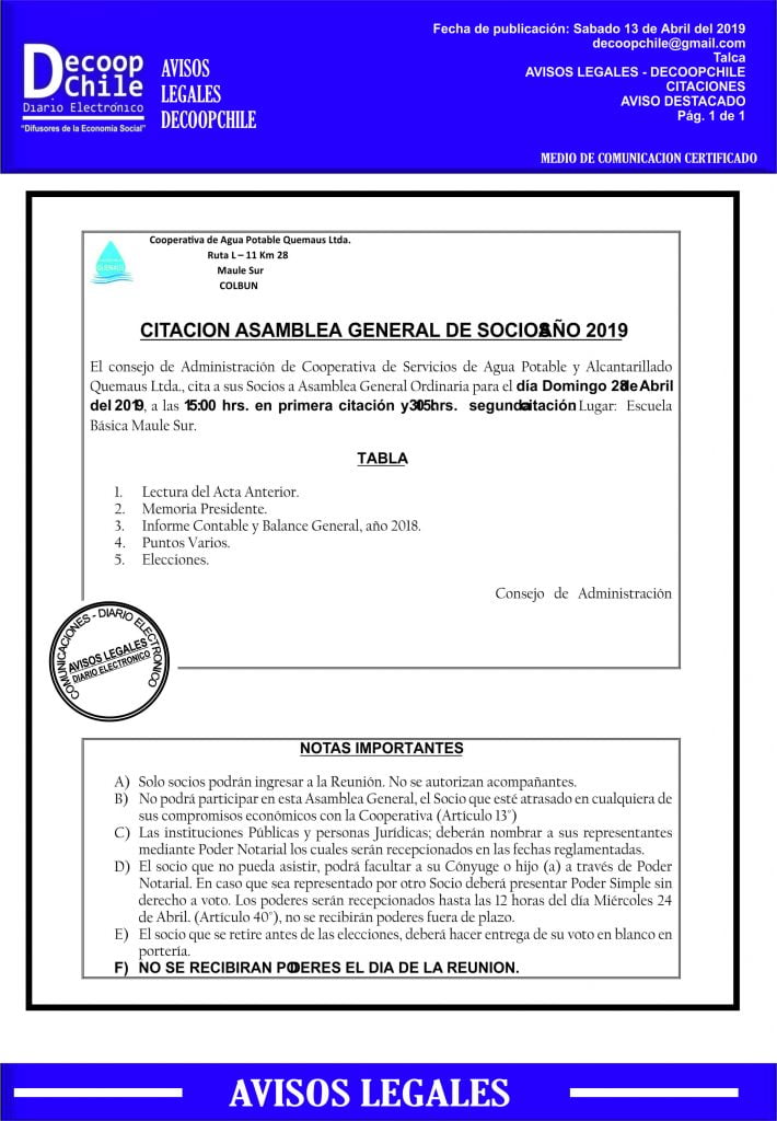 Se cita a Junta de Socios de la Cooperativa APR Quemaus, que se llevará a cabo el próximo 28 de Abril.