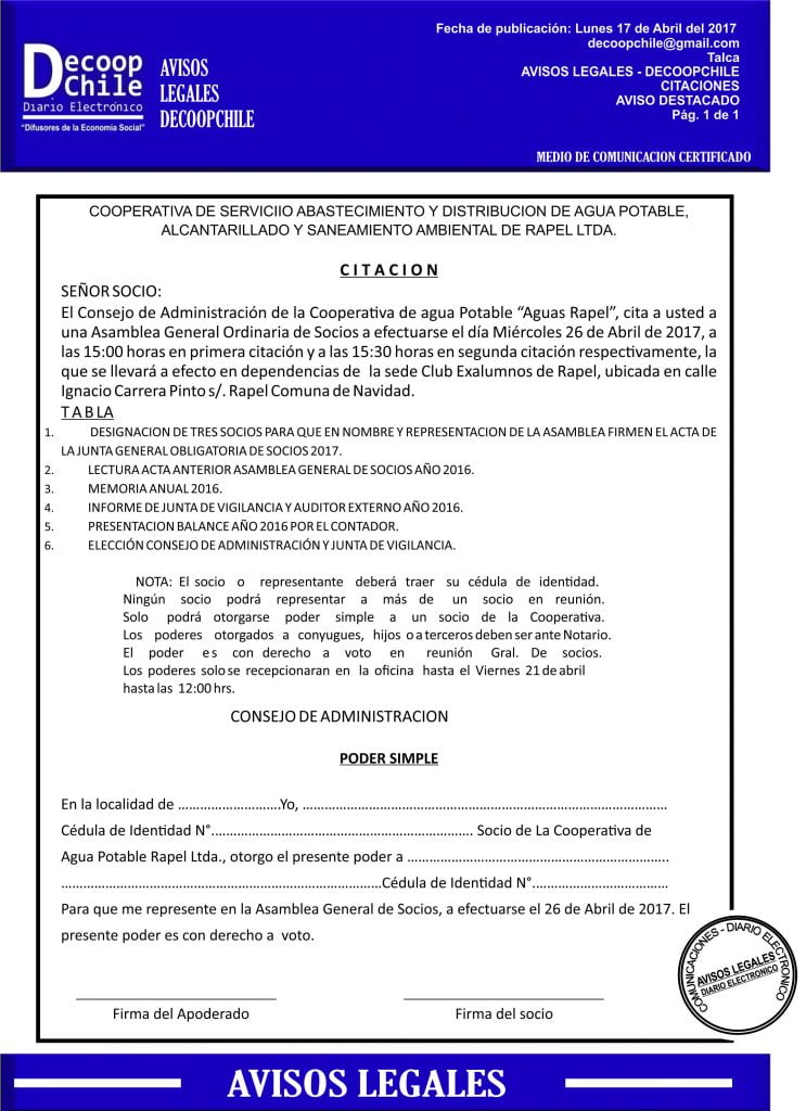 Junta General de Socios: “Cooperativa APR Rapel Ltda.”