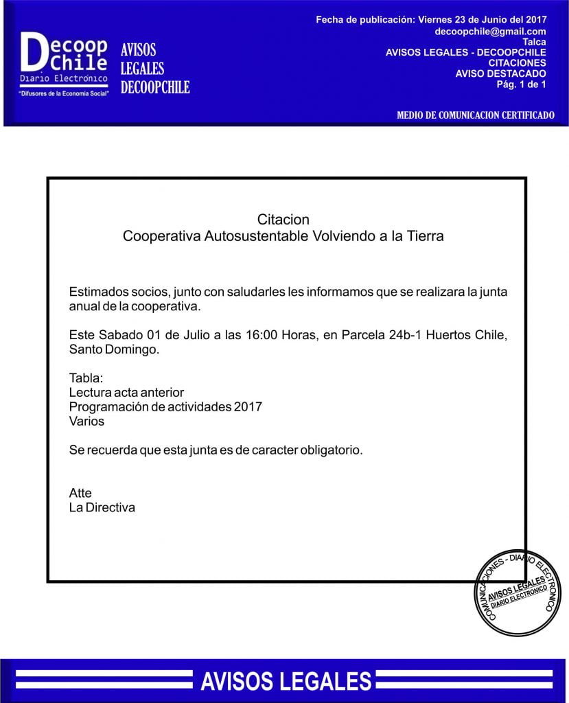 Se cita a Junta general a los socios de la Cooperativa Autosustentable Volviendo a la Tierra, que se llevará a cabo el próximo 01 de Julio.