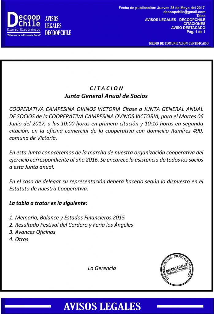 item-thumbnailSe cita a Junta general a los socios de la Cooperativa Campesina Ovinos Victoria , que se llevará a cabo el próximo 06 de Junio.