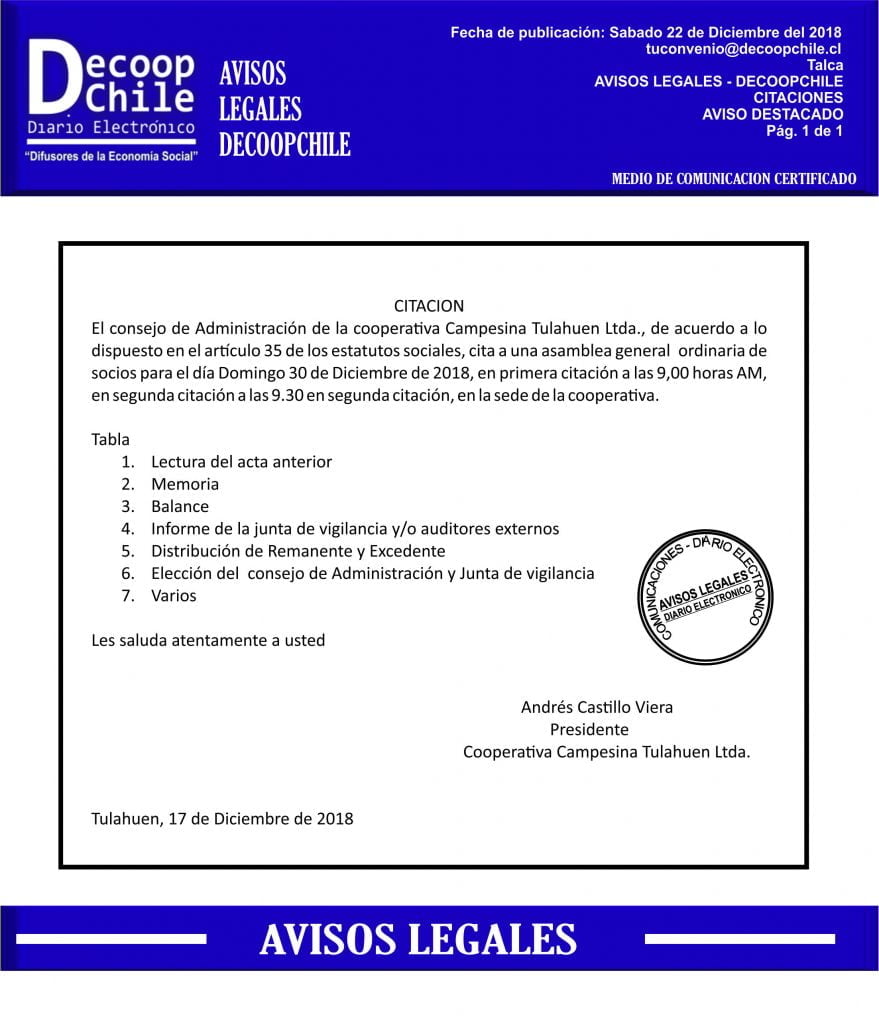 Se cita a  Junta de Socios  de la Cooperativa Campesina Tulahuen que se llevará a cabo el próximo 30  de Diciembre