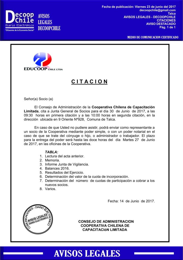 Se cita a Junta general a los socios de la Cooperativa Chilena de Capacitación, que se llevará a cabo el próximo 30 de Junio.