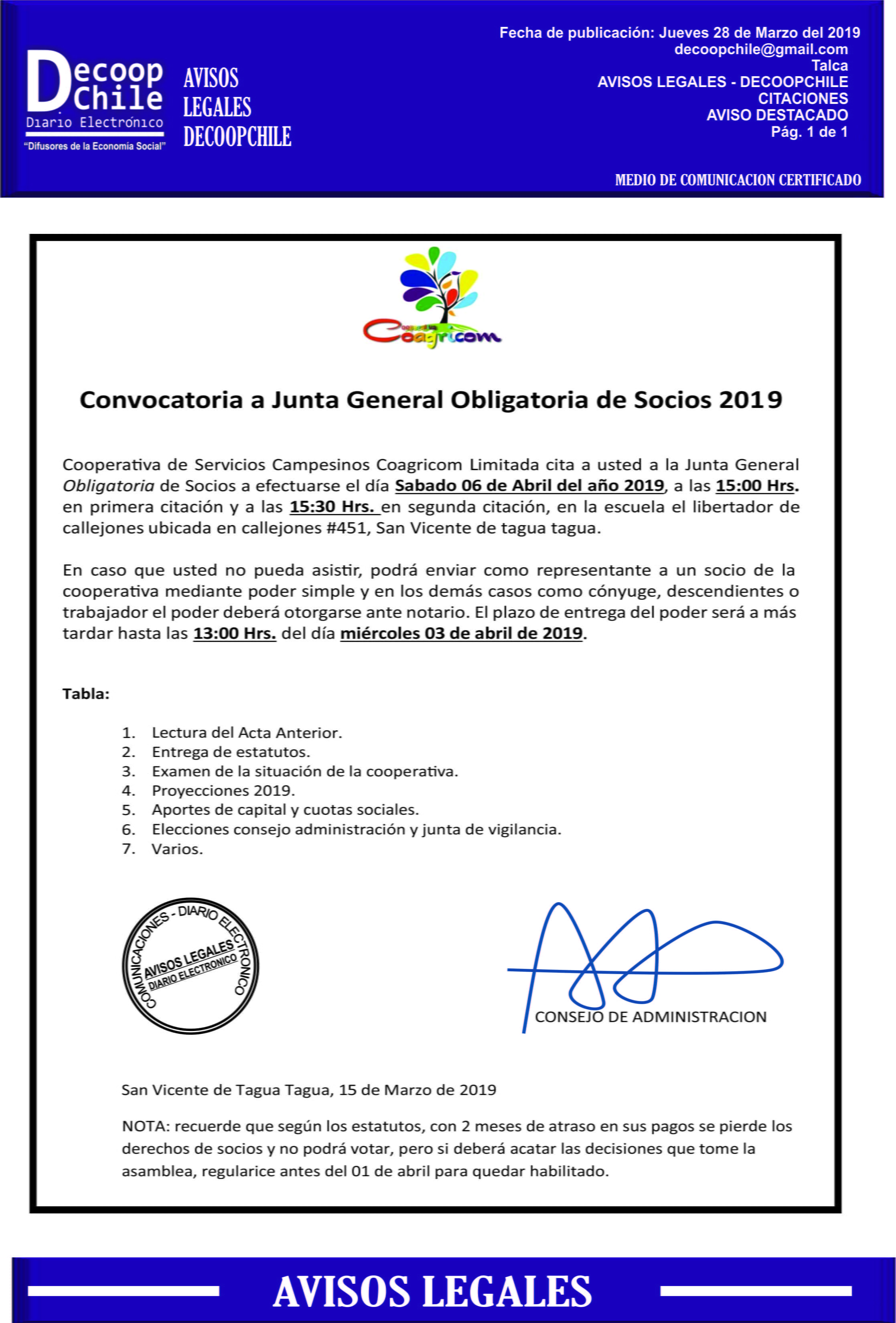 Se cita a Junta de Socios de la Cooperativa Coagricom, que se llevará a cabo el próximo 06 de Abril