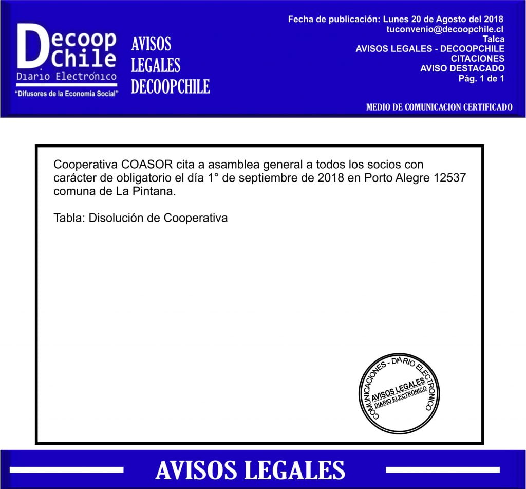 Se cita a Junta de Socios de la Cooperativa Coasor, que se llevará a cabo el próximo 01 de Septiembre