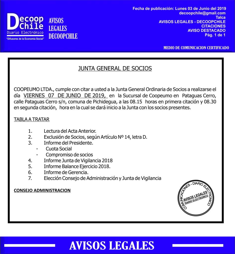 Se cita a Junta de Socios de la Cooperativa Coopeumo que se llevará a cabo el próximo 07de Junio