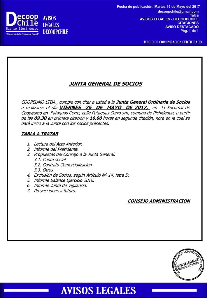 Junta General de Socios: “Cooperativa Coopeumo Ltda.”