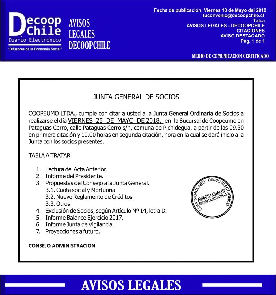 Se cita a Junta general a los socios de las Cooperativa Coopeumo que se llevará a cabo el próximo 25 de Mayo.
