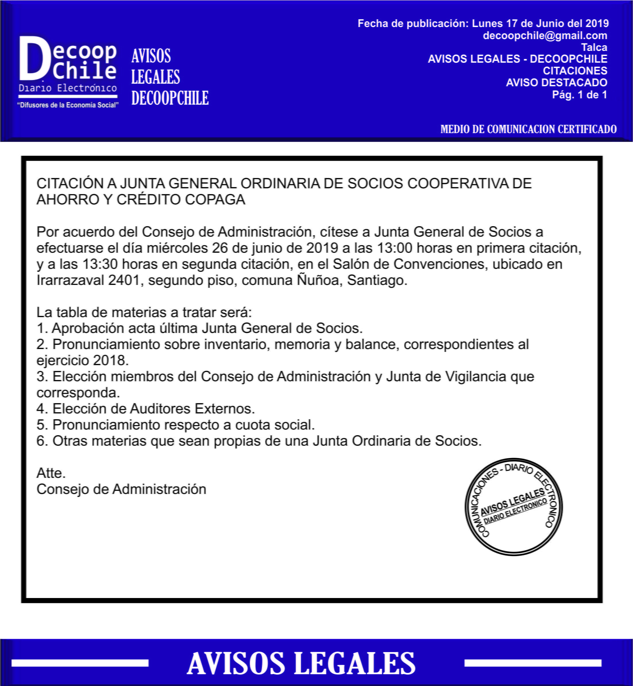 Se cita a Junta de Socios de la Cooperativa Copaga que se llevará a cabo el próximo 26 de Junio