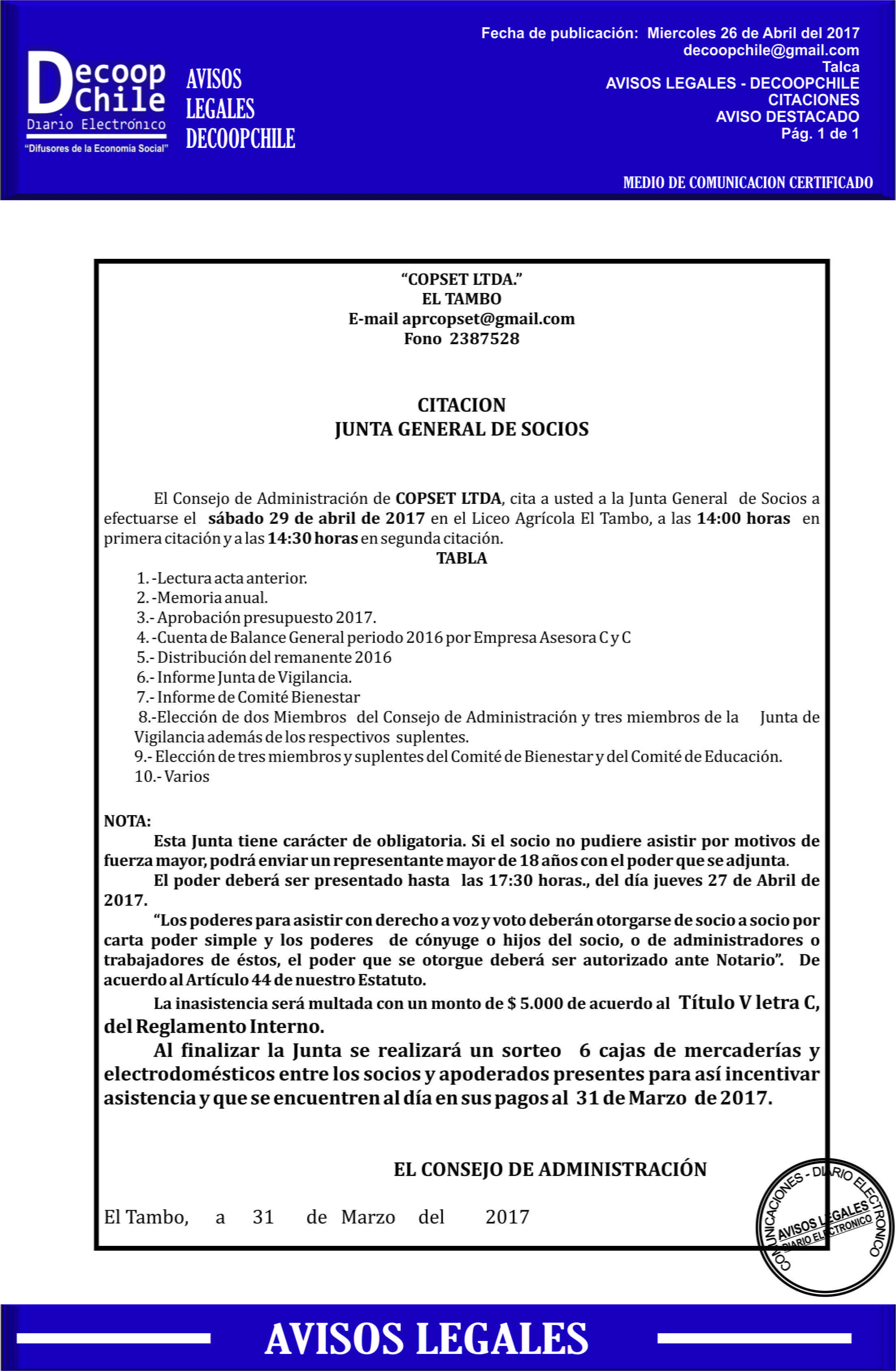 Se cita a Junta general a los socios de la Cooperativa APR COOPSET Ltda, que se llevará a cabo el próximo 26 de abril.