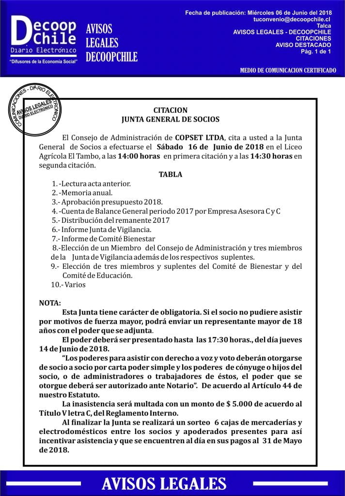 Se cita a Junta general a los socios de la Junta General de Socios: Cooperativa COPSET Ltda. que se llevará a cabo el próximo 16 de Junio.