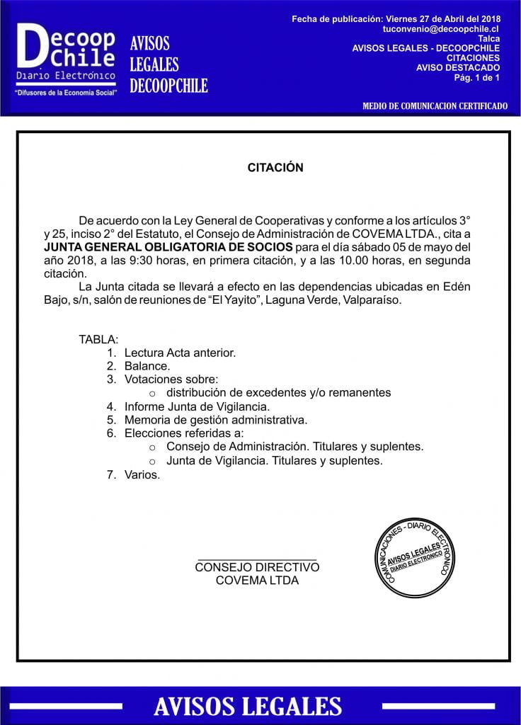 Se cita a Junta general a los socios de la Cooperativa Covema Ltda. a la celebración de la Asamblea General Ordinaria de Socios, que se llevará a cabo el próximo 05 de Mayo.
