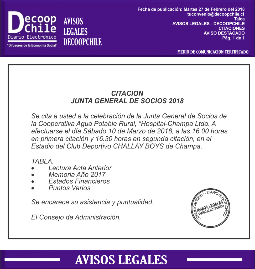 La Cooperativa de A.P.R. Hospital Champa Limitada.  cita a una junta general de socios para el día 10 de marzo de 2018.