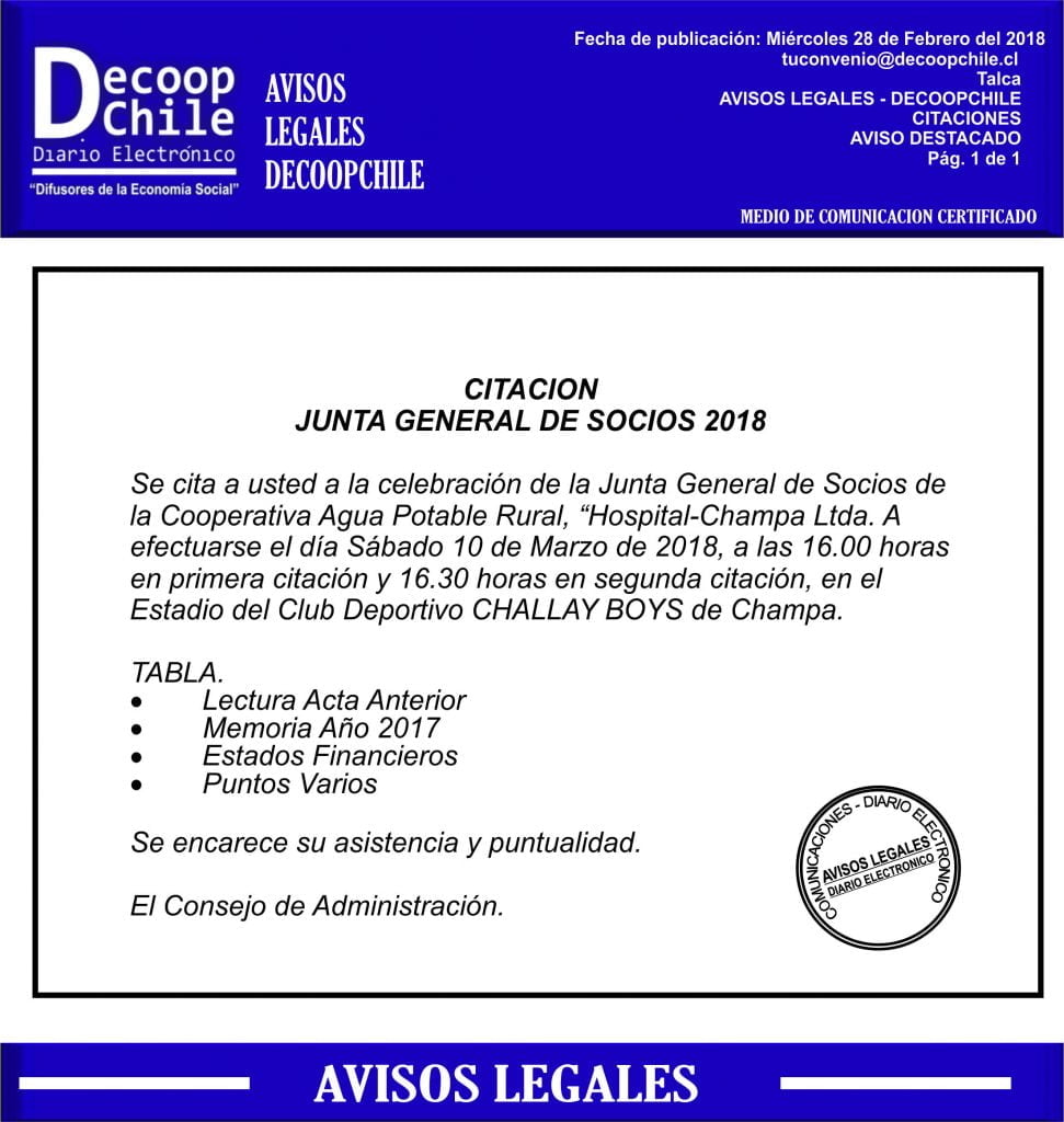 La Cooperativa de A.P.R. Hospital Champa Limitada. cita a una junta general de socios para el día 10 de marzo de 2018.