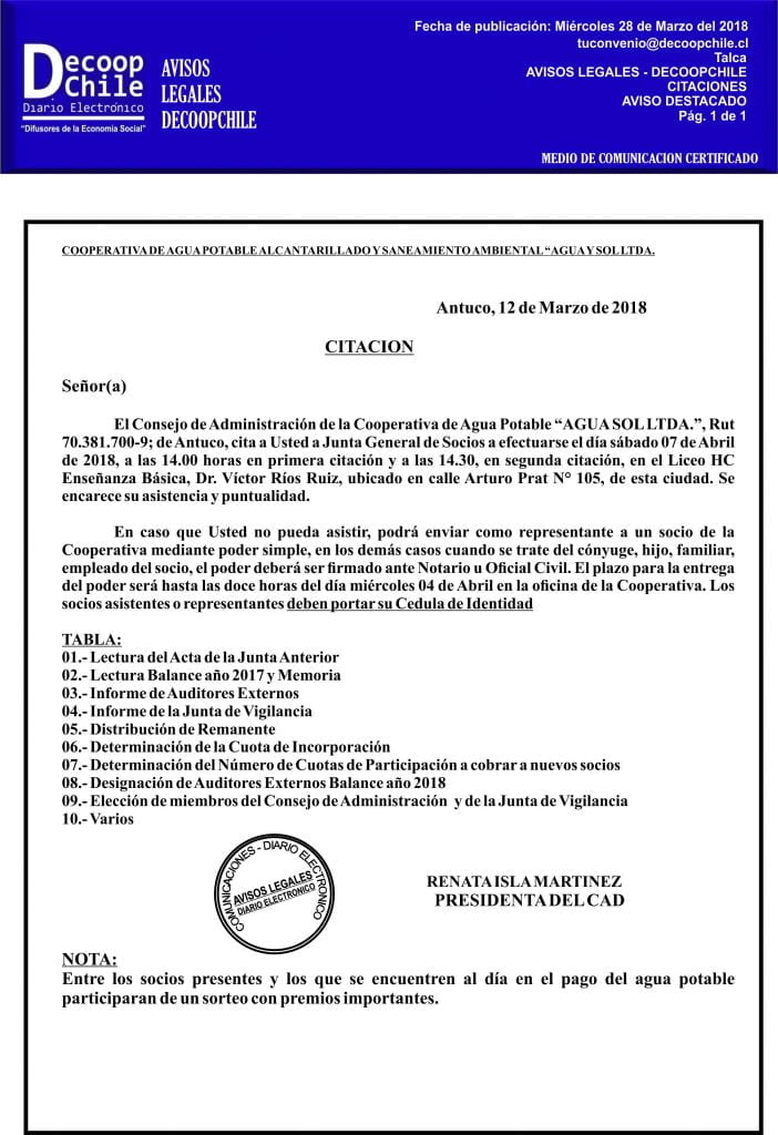 La Cooperativa de Agua Potable Agua y Sol . cita a una junta general de socios para el día 07 de Abril de 2018.