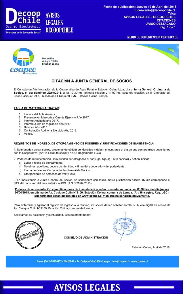 La ”Coperativa APR  Estación Colina” cita a una junta general de socios para el día 29de Abril de 2018.