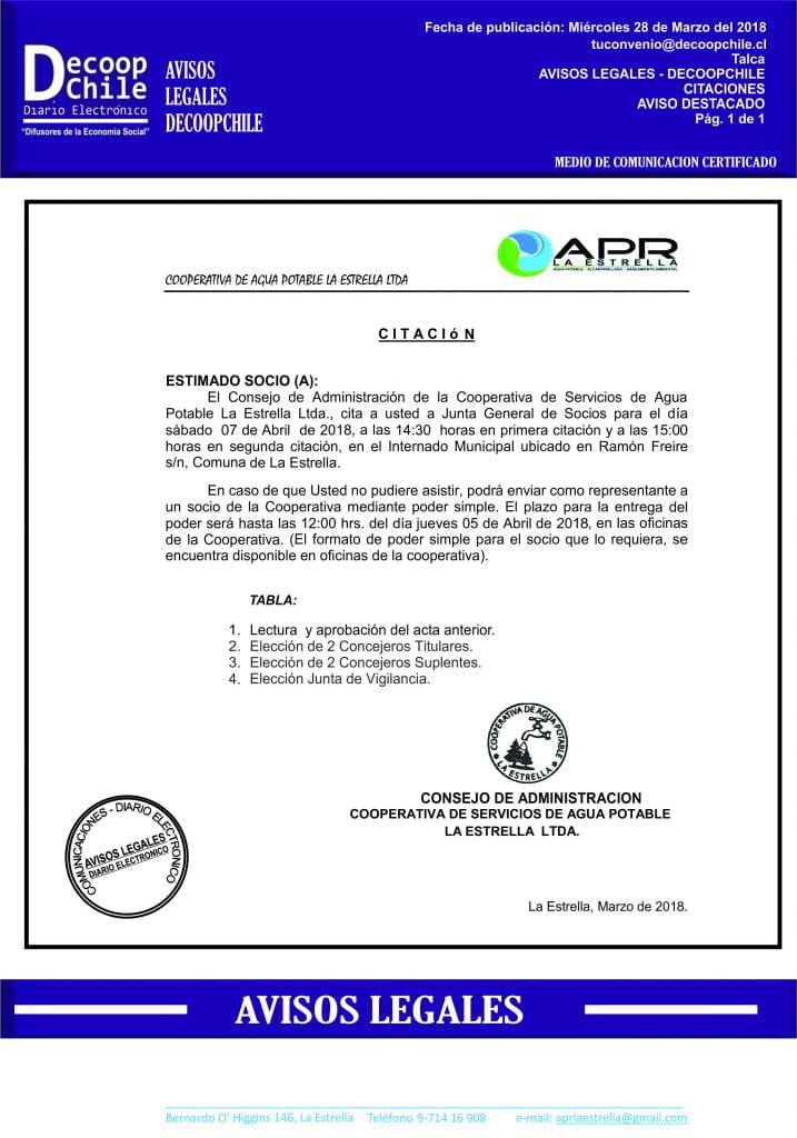 La Cooperativa de Agua Potable  La Estrella Ltda. cita a una junta general de socios para el día 07 de Abril de 2018.