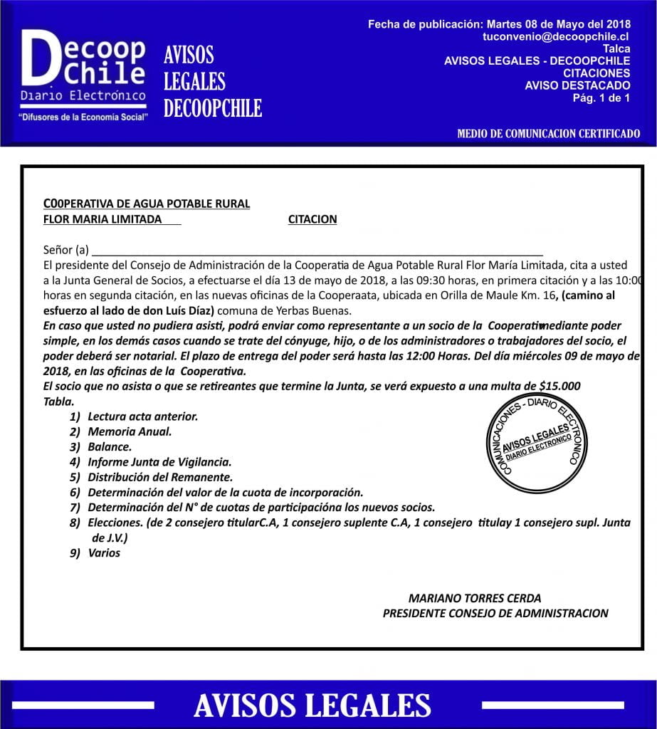 Se cita a Junta general a los socios de las Cooperativa de Agua Potable Rural Flor María Limitada  que se llevará a cabo el próximo 13 de Mayo.