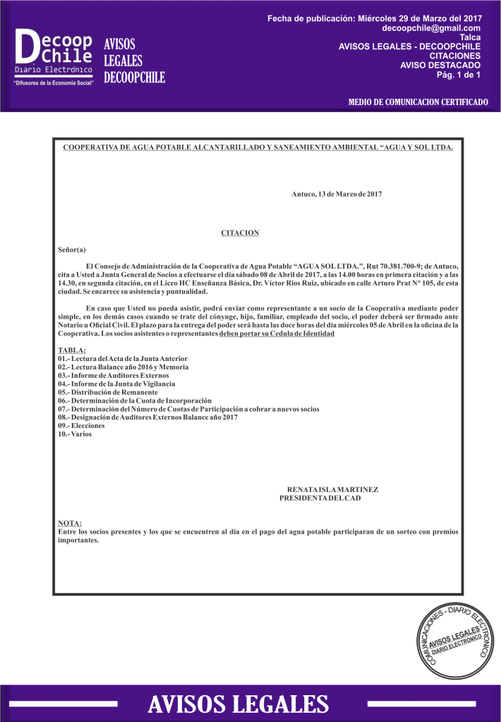 item-thumbnailSe cita a Junta general a los socios de la Cooperativa APR Agua Sol Ltda. este Sabado 08 de Abril de 2017